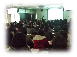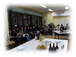 発表会終了後、毎年恒例の3回生主催による予餞会が生協食堂で開催されました。こちらも1回生から大学院生まで、多くの参加があり、盛り上がりました。この中で、恒例の食物栄養学賞(奨励制度参照)の授与が行われました。本学創立100周年を迎えたこと、また上位者の成績が僅差であったことから、本年度は3名が受賞し、賞状、金一封とともに、100周年記念ワインが贈呈されました。1回生、2回生、3回生も食物栄養学賞を目指して勉学に励んでください。