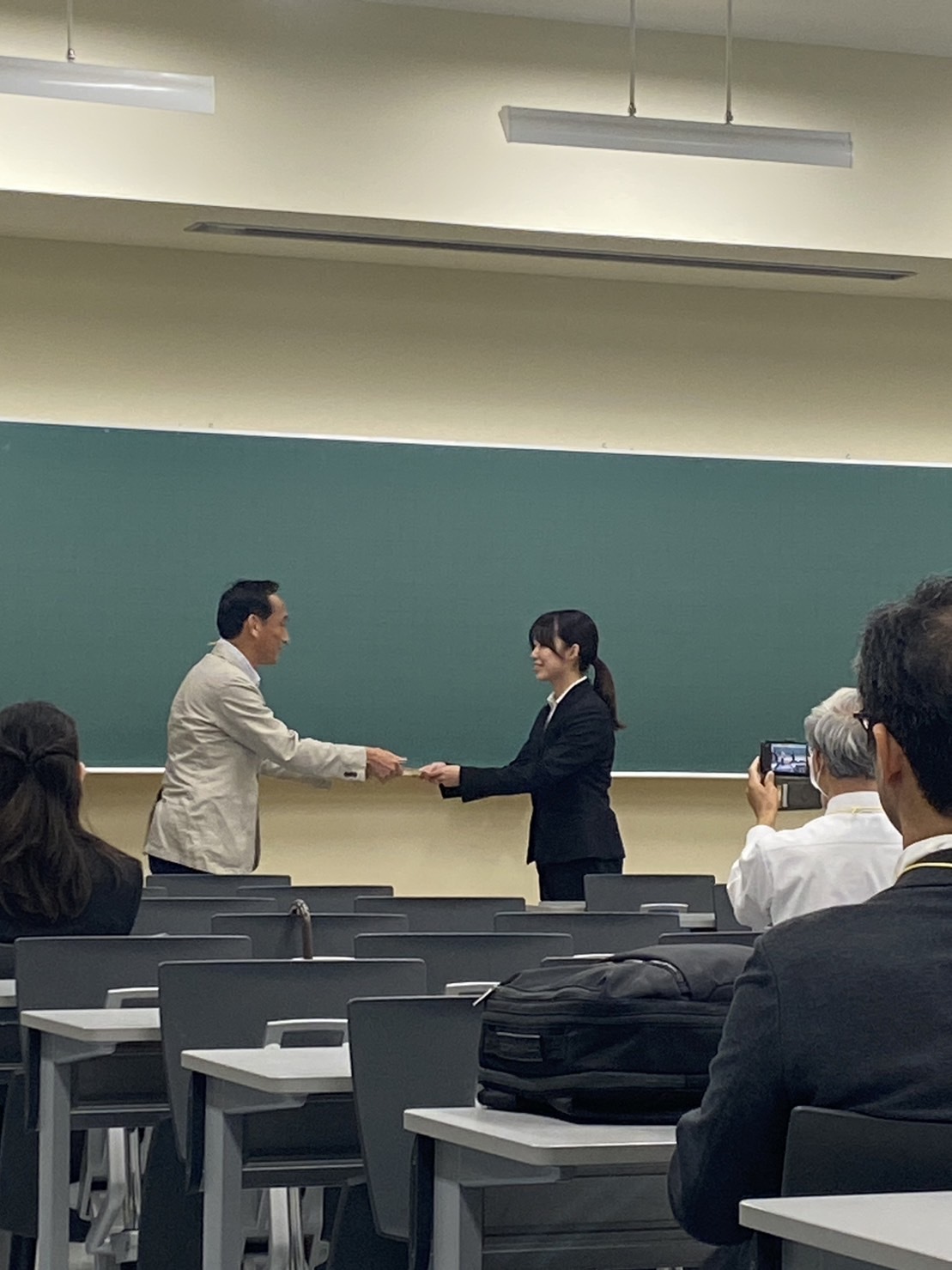 令和5年10月14日に近畿大学奈良キャンパスにて開催された日本家政学会2023年度関西支部研究発表会にて食物栄養学専攻 1回生 今西花梨さんが『グルテンフリー玄米粉パン調製に対する玄米粉粒度の影響』の演題名にて【若手優秀発表賞】を受賞されました。