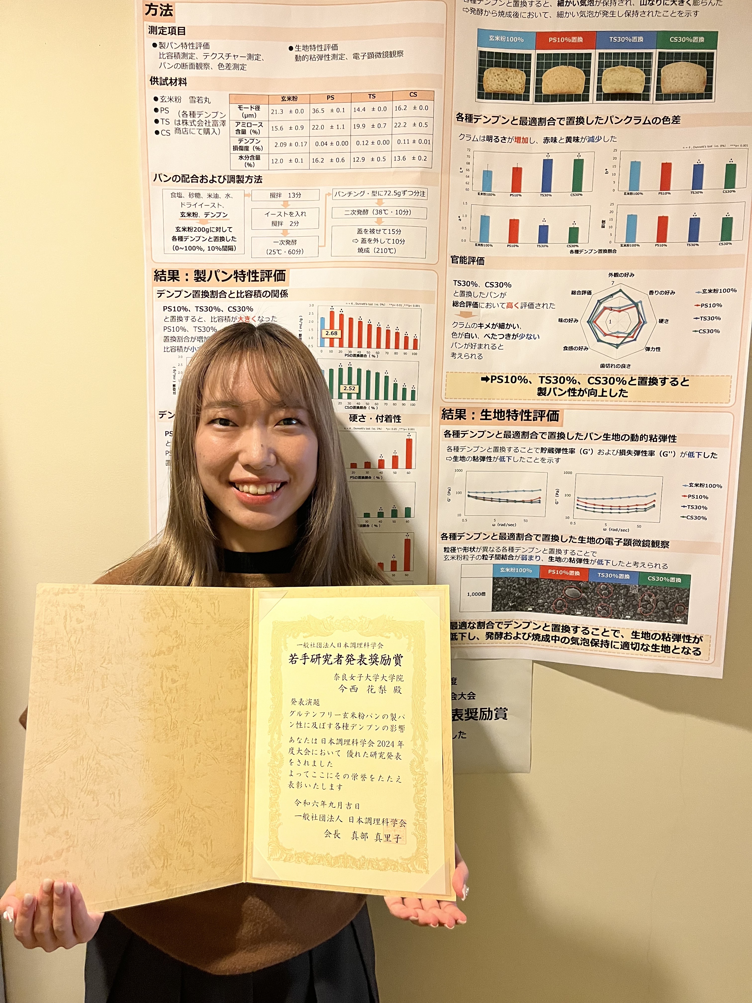 2024年9月6~7日、鎌倉女子大学で開催された日本調理科学会2024年度大会において、修士課程2回生の今西花梨さんが『グルテンフリー玄米粉パンの製パン性に及ぼす各種デンプンの影響』を演題として【若手研究者発表奨励賞】を受賞しました。