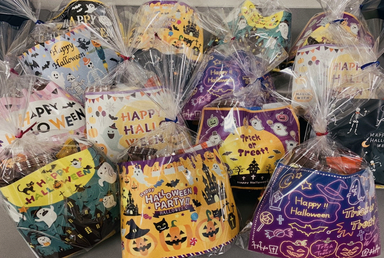 ちなみに私はお茶室係なので、研究室の皆さんにハロウィンっぽく飾り付けしたお菓子の詰め合わせを配りました!とても喜んでくださって嬉しかったです(^^)