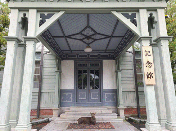 先日、記念館の入口前に鹿が座っていたので写真を撮ってみました。記念館の主のようでかっこいいです!
