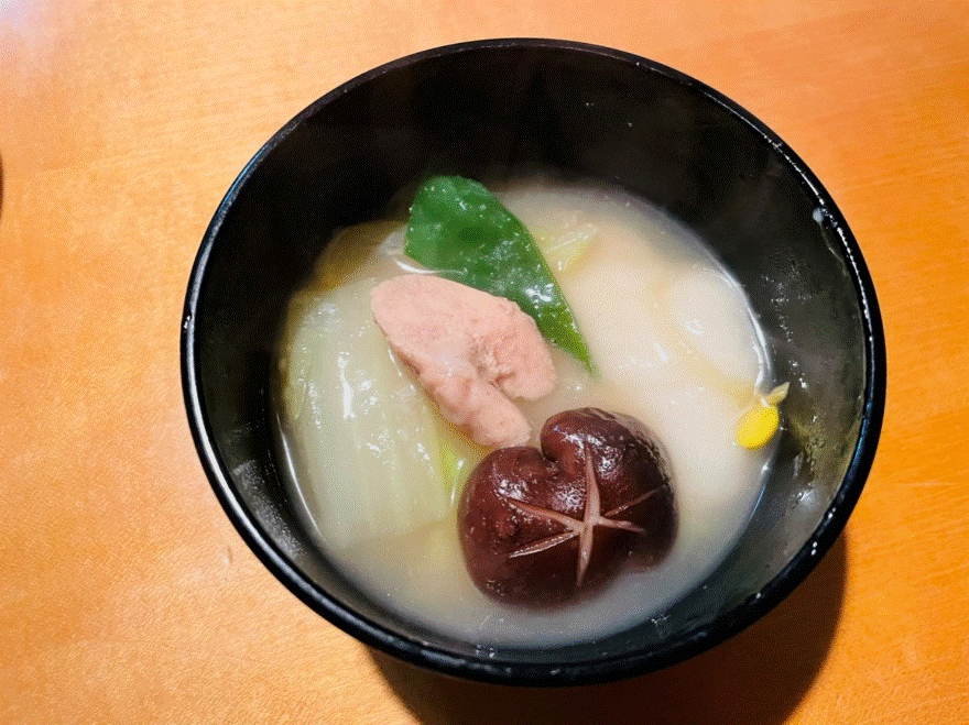 我が家のお雑煮は、鰹節と干し椎茸の出汁に醬油で味付けして、お餅、鶏肉、白菜、ネギ、おやし、椎茸を具材に加えたものです。