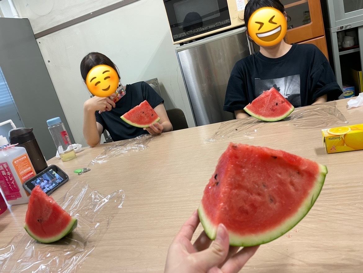 また、中間報告会の翌週には、先生からスイカを頂きました。お茶室で甲子園の中継を見ながらみんなで美味しく食べました!