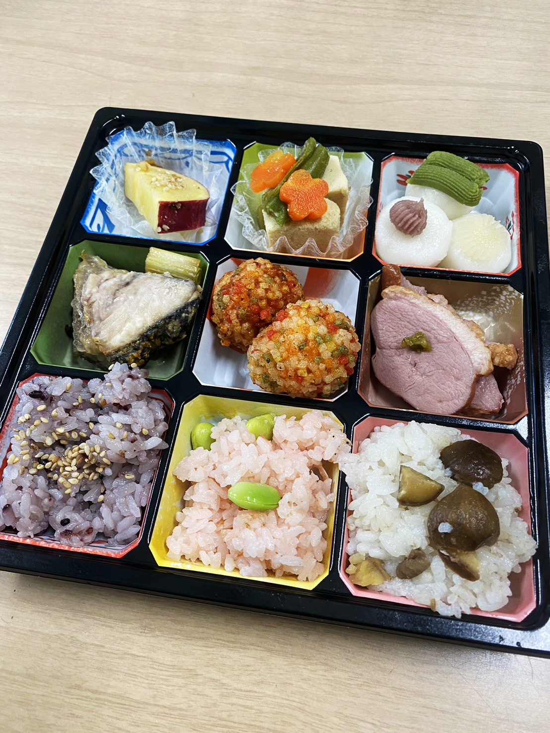 初日には、研究室のみんなで季節弁当を食べました。係の人を中心に、4回生が一から作り上げたお弁当は、ほっぺたが落ちるほどおいしかったです。