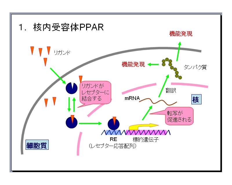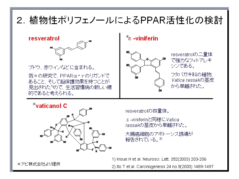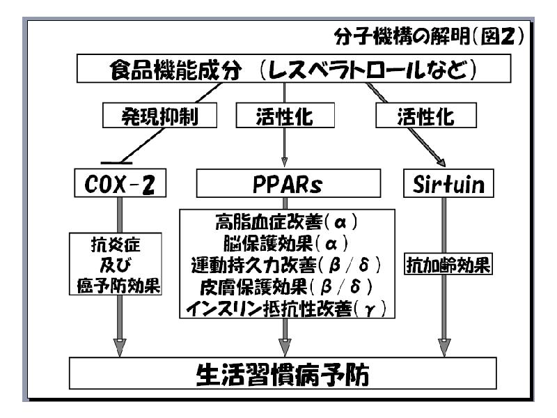 「薬食同源」の考え方に基づいて、機能性食品成分の作用は、薬の作用する標的と基本的には同じであると考え、研究を進めています。現在は、アスピリンなど非ステロイド性抗炎症薬の標的であるシクロオキシゲナーゼ(COX)や高脂血症、糖尿病の治療薬の標的である核内受容体PPARと、機能性食品成分の関係を明らかにしていきたいと考えています。この研究に関しては、日経BP社BTJジャーナル2006年6月号に、「メタボリックシンドロームに挑戦するお勧めの大学研究室」の一つとして、紹介してもらいました。研究面でのライバルで友人でもある京都大学河田照雄先生、東京大学佐藤隆一郎先生も同様に紹介されており、負けないようにしっかりした研究をしていきたいと考えています。
