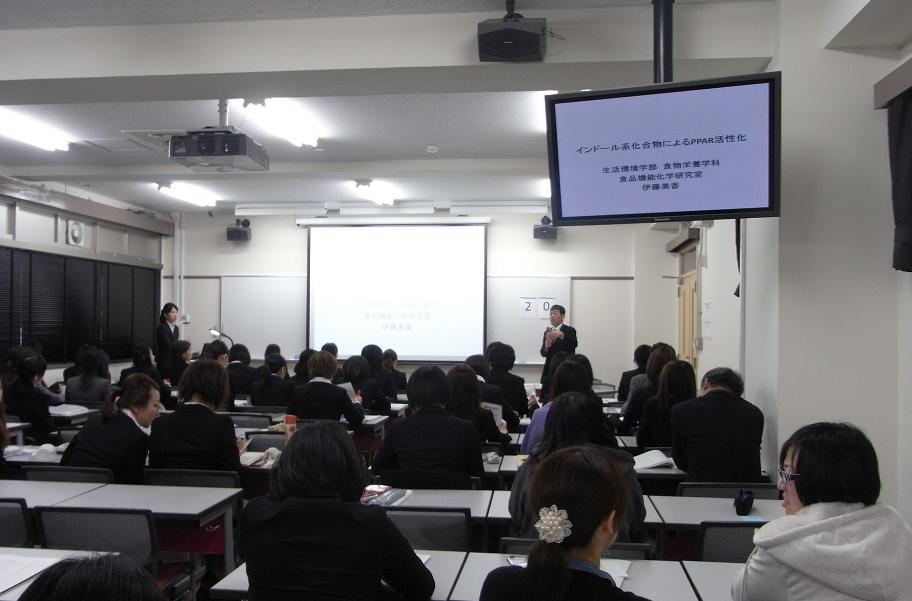 1年次では基礎となる科目をしっかり学習し,2年次と3年次では専門的な講義と実験・実習が展開されます。最終学年では,各研究室に配属し,食物栄養学の最先端の問題からテーマを選び,卒業研究を行います。研究室では,先生1人あたり数人という小人数教育がなされ,各先生のきめこまやかな指導のもとで,各自の研究テーマに従って実験・研究を行い,卒業研究を仕上げ,卒論発表会さらには,関連の学会で発表します。研究室のゼミでは先生方や大学院の先輩方との活発な討論が展開され,人間的なふれあいの中で,食物と栄養に関する高度で,最先端の専門知識が深められています。